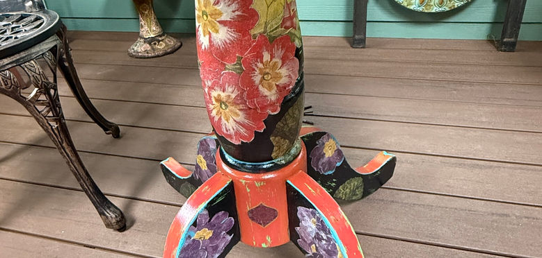 This round table was rescued from a carport. As with all my furniture, the Frida table was created using mixed media of paint, ink, and paper. She is surrounded by flowers and mystical animals, vibrant and happy. This piece can be purchased at Westside Market Toco Hill in Atlanta, GA.