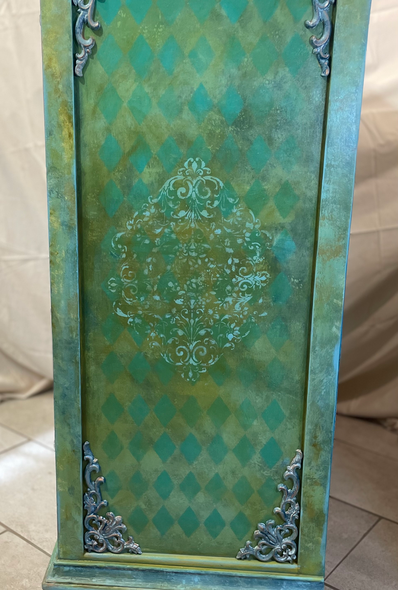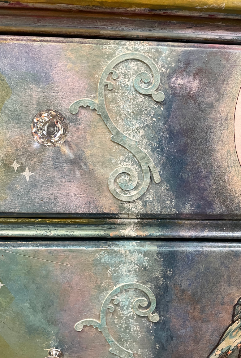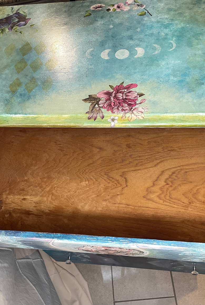 I believe this piece started life as a record player or radio. It was in bad shape so it was hard to tell. It is solid oak. I had the gorgeous Red Riding Hood decoupage paper to get me started, then added my own painting, ink, and wax.